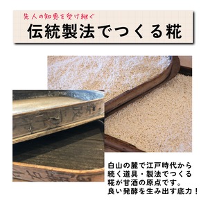 白山麓で育ったお米が糀(こうじ)にもなって、甘酒になります。自然発酵の結晶です。世の中に出回るのは白砂糖だったり人工甘味料が甘味の主流となった今、発酵の力によってできる米由来の甘さは、なんともいえないやさしさを感じます。
