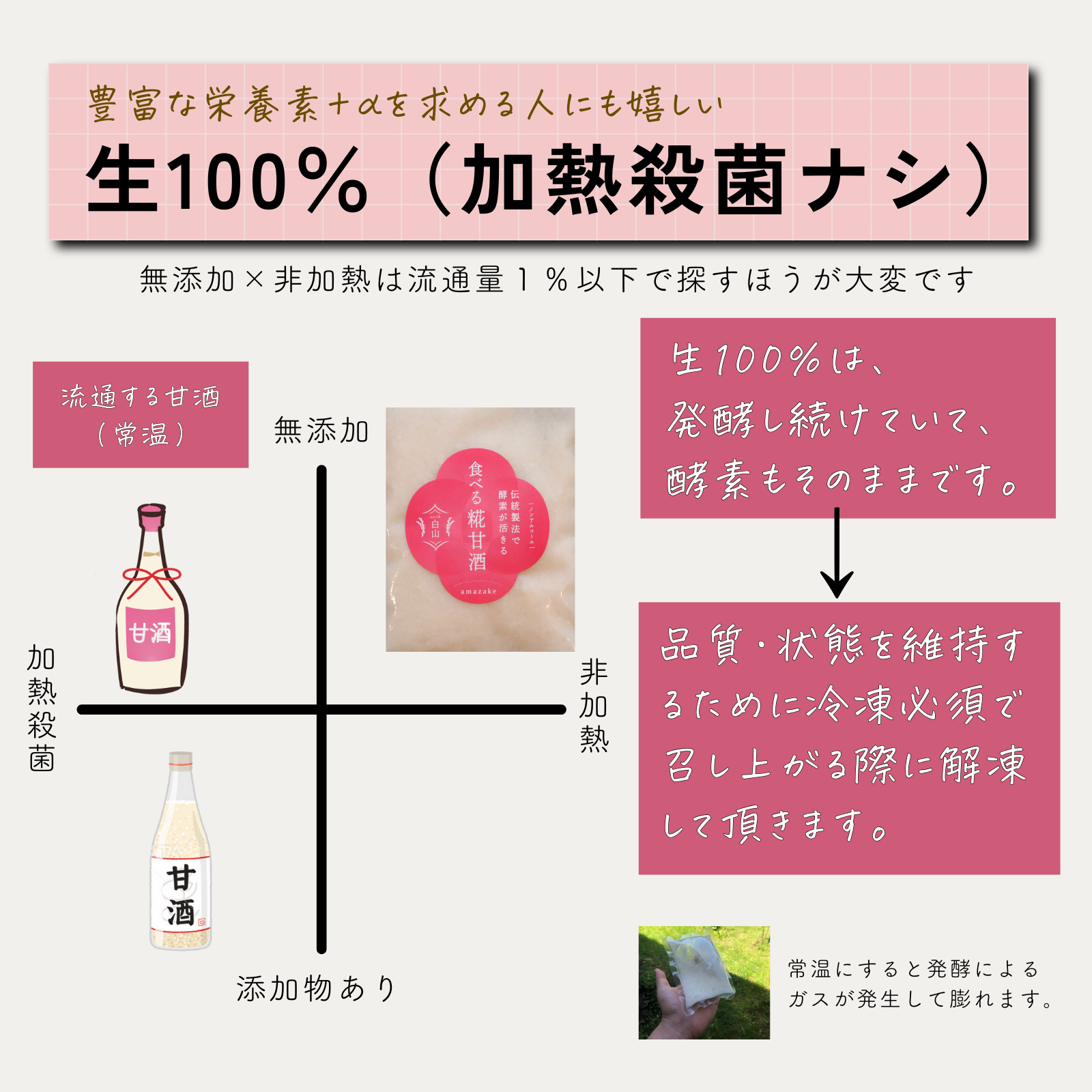 特に急速冷凍→真空包装は、食べるタイプの糀甘酒だからこそできるもので、これによってNYや香港向けにも輸出できるレベルにまでなりました。