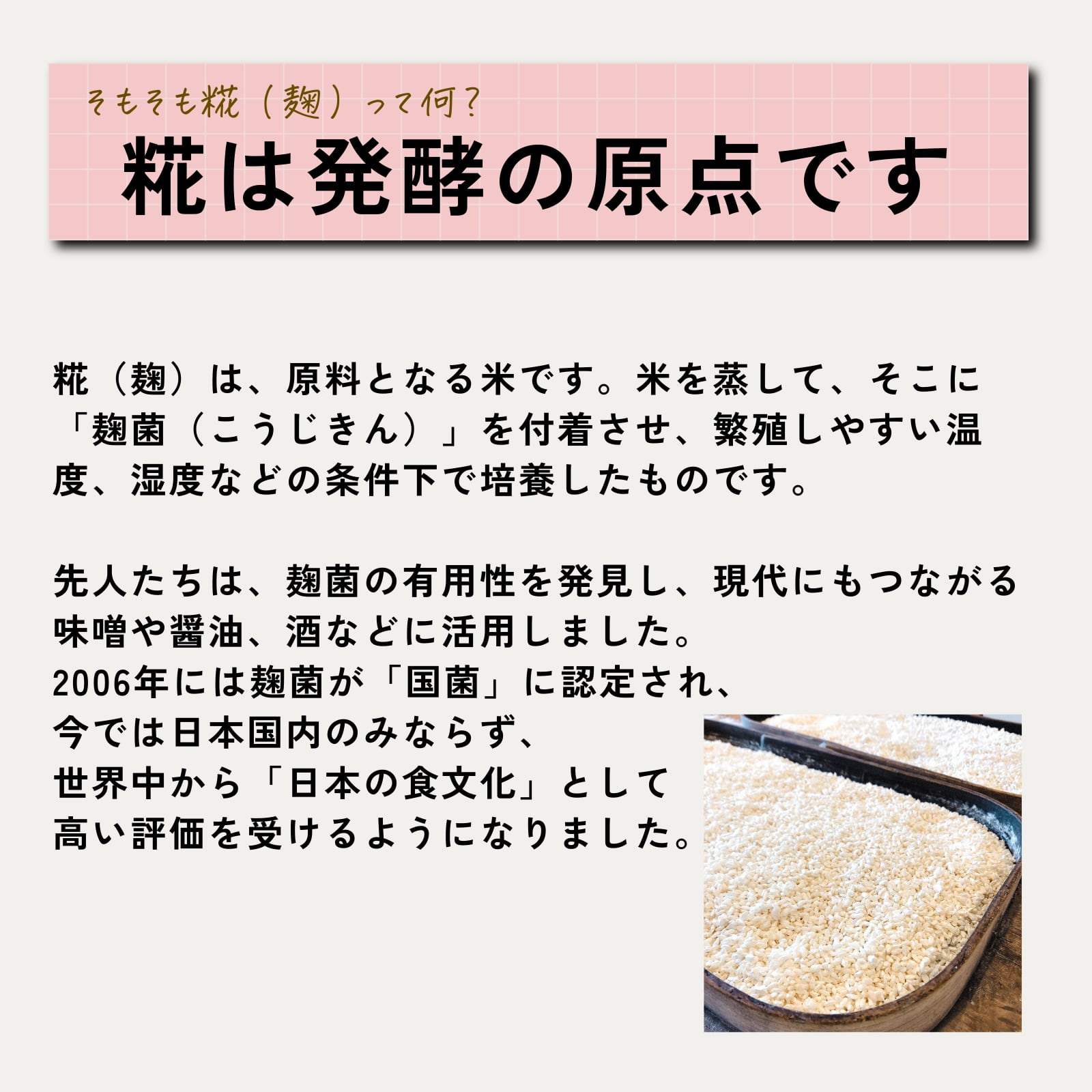 糀甘酒とは、糀菌によって米が発酵し、糖化することで自然と甘くなる日本の伝統発酵食です。砂糖でもなく、人工甘味料でもなく、自然のめぐみだけでつくられる甘さは「日本発のスーパーフード」としても注目されるようになりました。